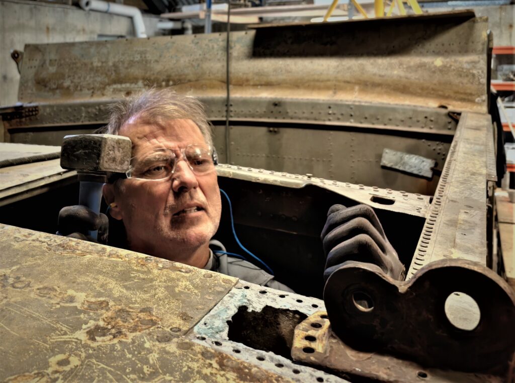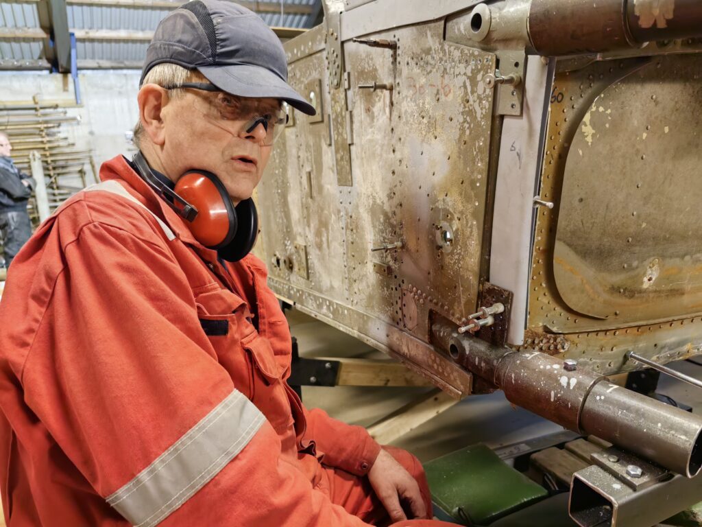 Egil Thomsen i godt driv i arbeidet med å bygge ny luke over bombesikter posisjonen fremme i Kanzel