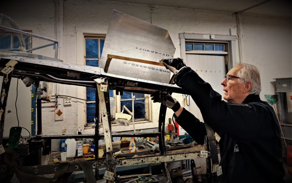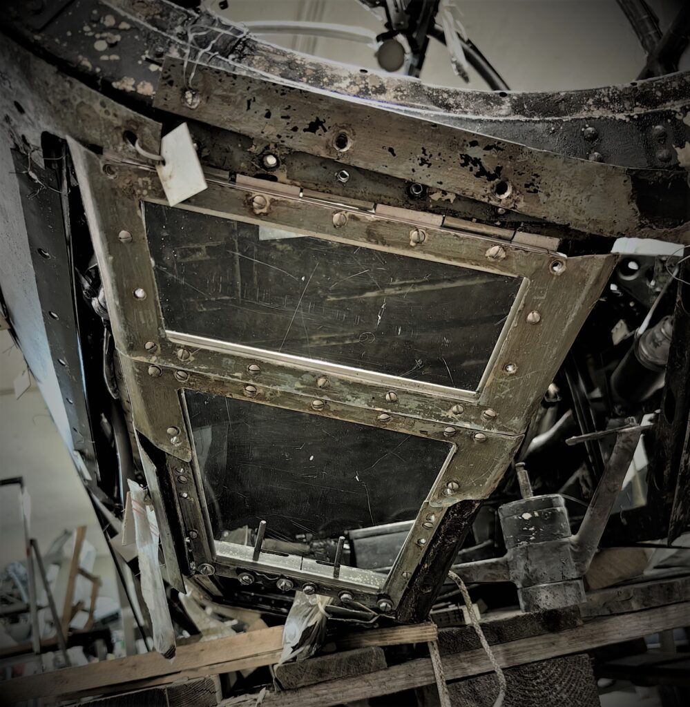 Fra arbeidet med å gjennoppbygge canopy over piloten. Her har vi noen originale deler som blir brukes i arbeidet.
