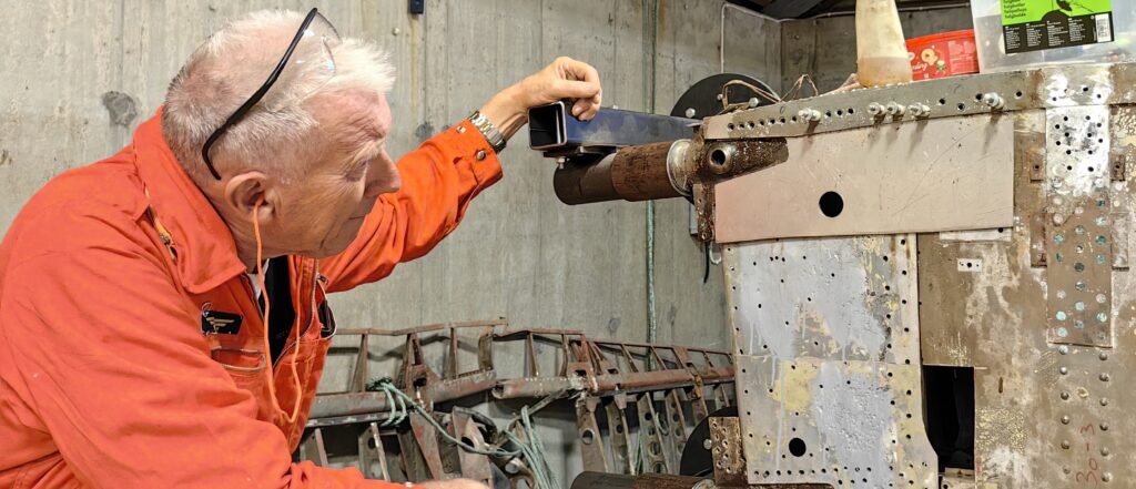 Harald Øverland i arbeid med fremre styrbord hjørne. Arbeidet med dette hjørnet er nå nesten ferdig.