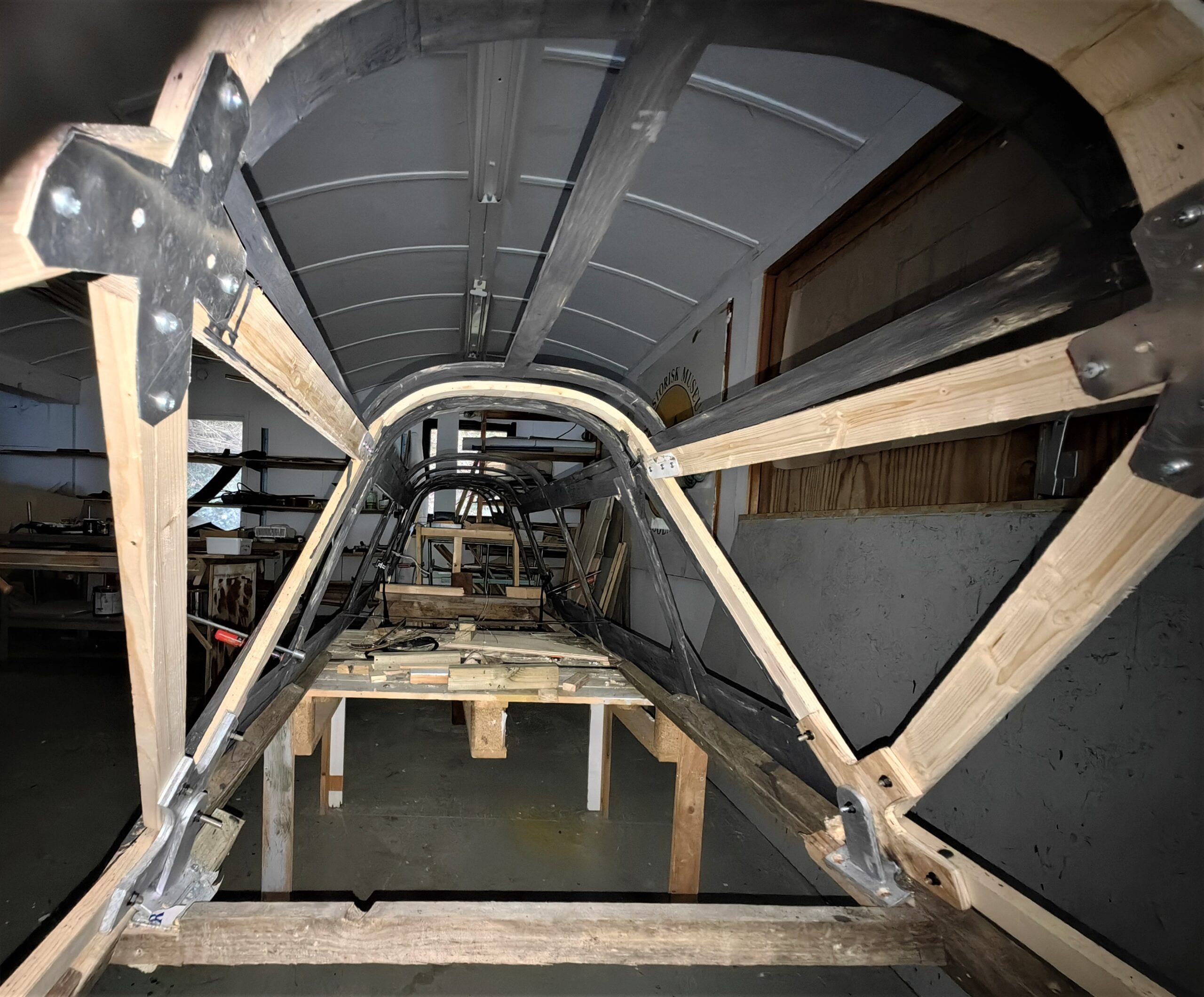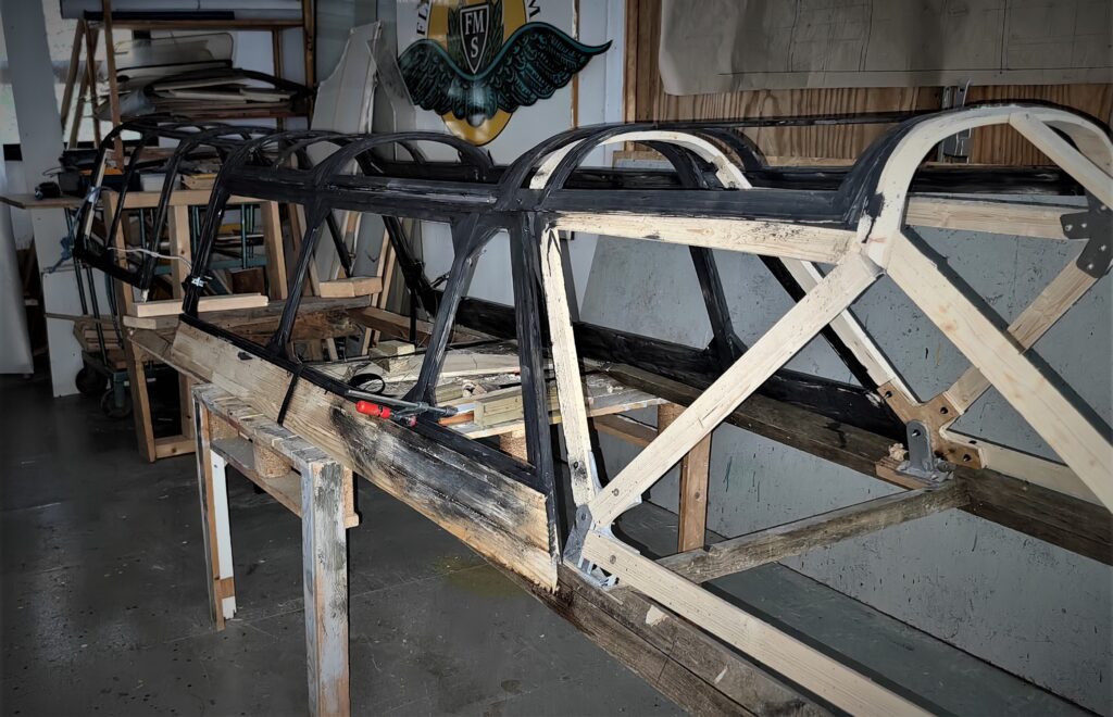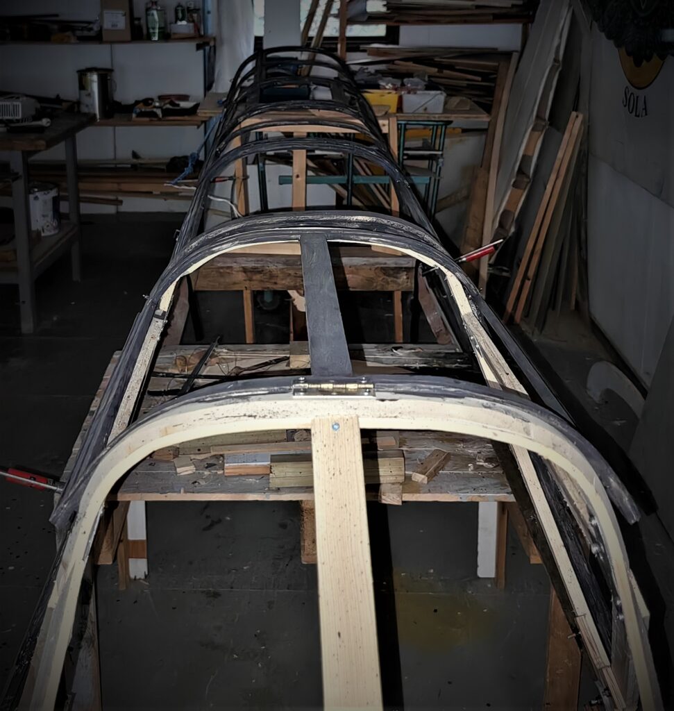 Hood, trerammen er nærmest ferdig bygget og venter på plexiglass og aluminiumslister. Den bakre luken vil bli bygget av aluminiums profiler.
