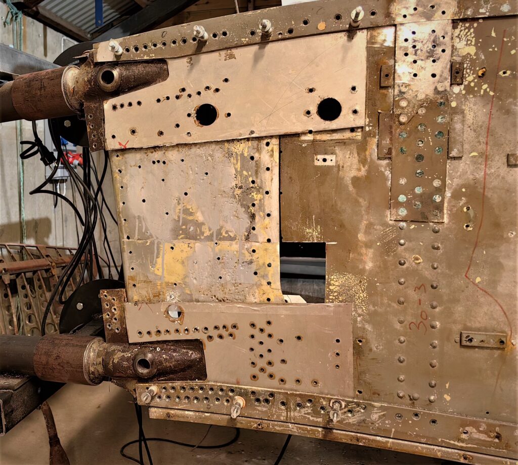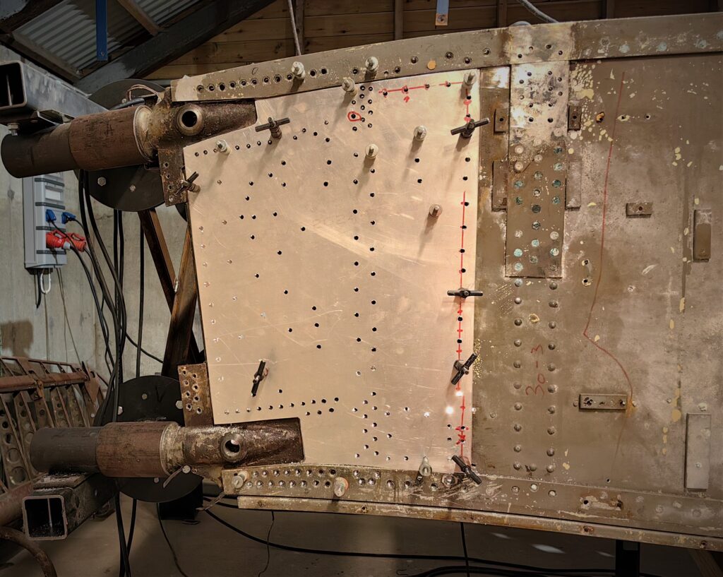 For å få fjernet korrosjon i babord ende av webbing måtte vi skjære ut et større stykke av denne. Spalten mellom vingebjelkene og webbing er så trang at vi fikk ikke satt på plass igjen en hel ny plate. Vi valgte derfor å gå opp i material kvalitet for på denne måten å kunne redusere tykkelsen på de platene som er stukket ned i de svært trange spaltene.
